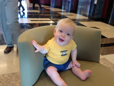 He vocalizes some, points all the time, creeps along walls/furniture, has taken a few steps, crawls really fast, can go up stairs if we let him, opens flaps in flap books, turns pages in real books, turns the light switch on/off if you hold him up, swipes up/around on my iPhone, climbs up into G's toddler bed, and he has the most mischievous grin. He is a handsome little boy and totally knows it.